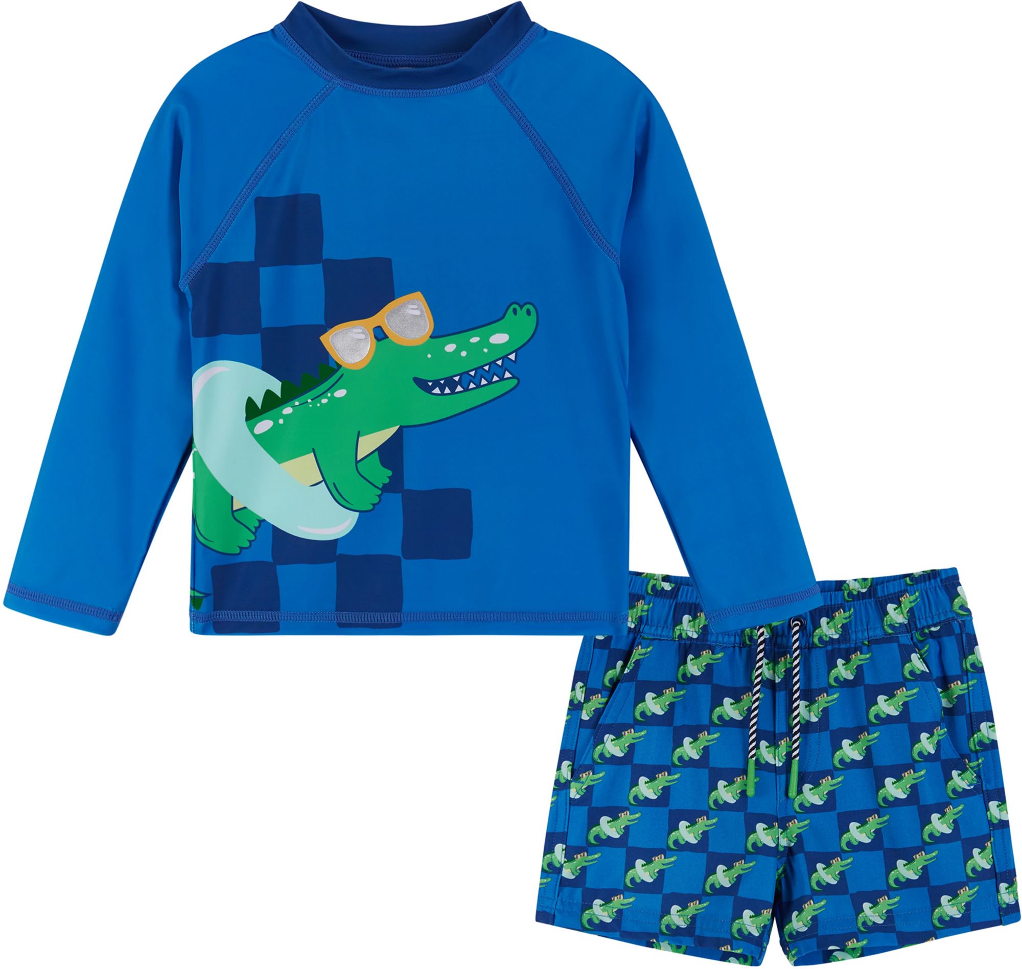 Let your toddler take on the waves in this bold animal-themed rashguard and boardshort set. Designed for all-day fun in the sun, the rashguard features comfortable raglan sleeves and a fierce graphic, while the matching boardshorts offer a secure fit and fast-drying performance. Built-in UPF 50+ protection keeps him safe and stylish.