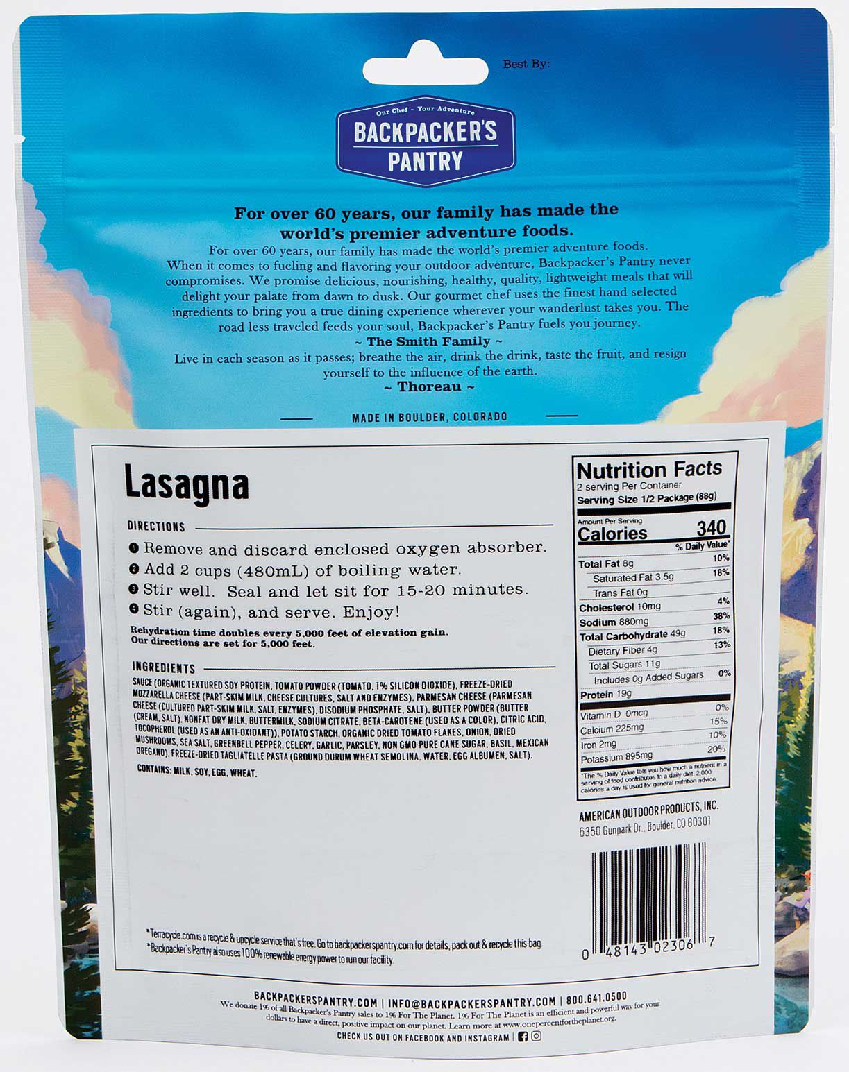 Enjoy a delicious meal with the Backpacker’s Pantry® Lasagna. This entire vegetarian meal is made with tomatoes, parmesan cheese, noodles, vegetarian ground beef and Italian seasonings. You’ll be ready to keep going with this high protein meal. When hunger strikes, simply add boiling water and you’re ready to go. You need to refuel on the go and Backpacker’s Pantry Lasagna is the ideal take along.