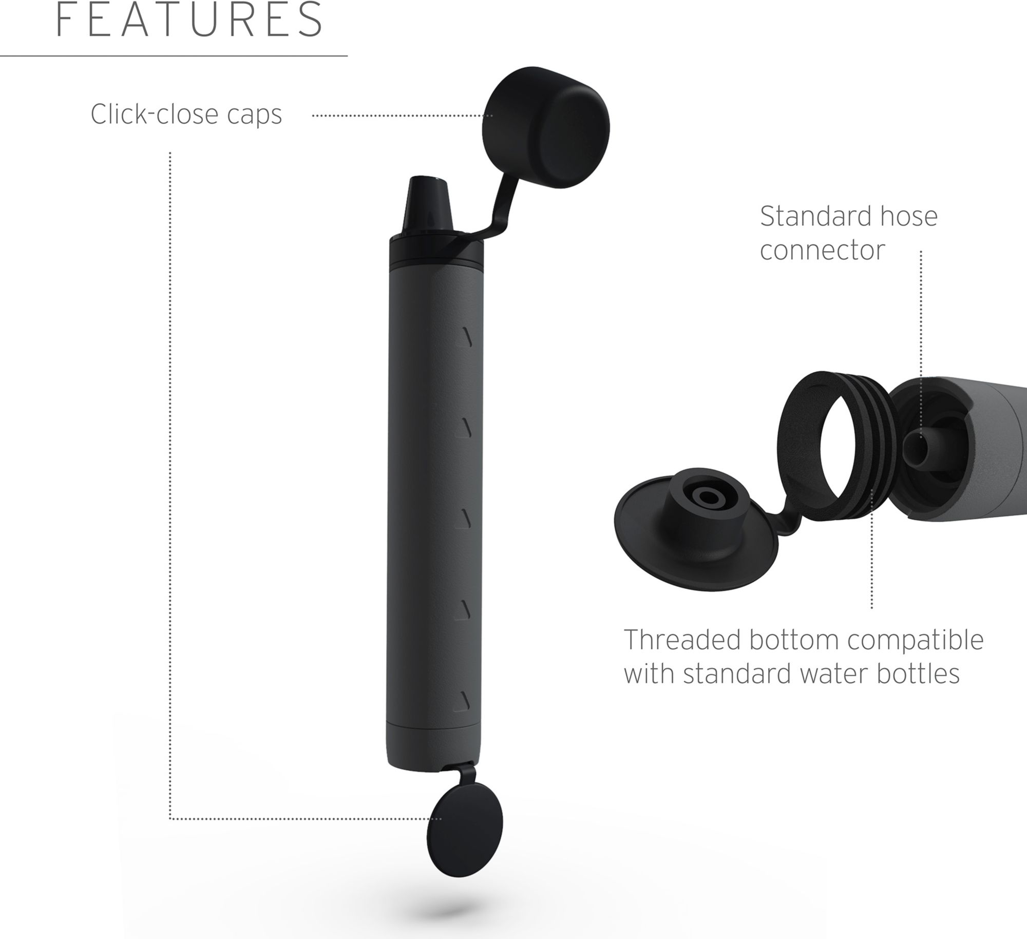 Highly versatile: Can also be attached to water bottles and to standard gravity hoses with removable threaded bottom cap