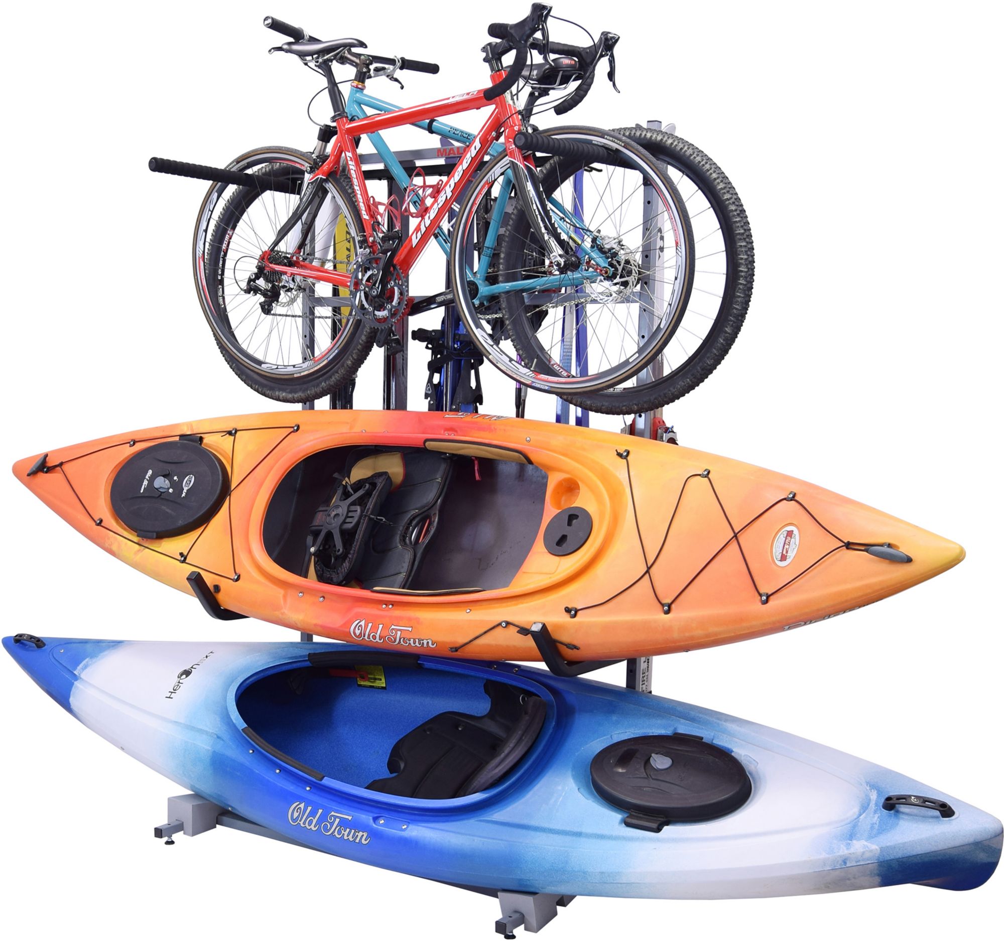 Securely stores three (3) bikes, two (2) kayaks and six (6) sets of skis