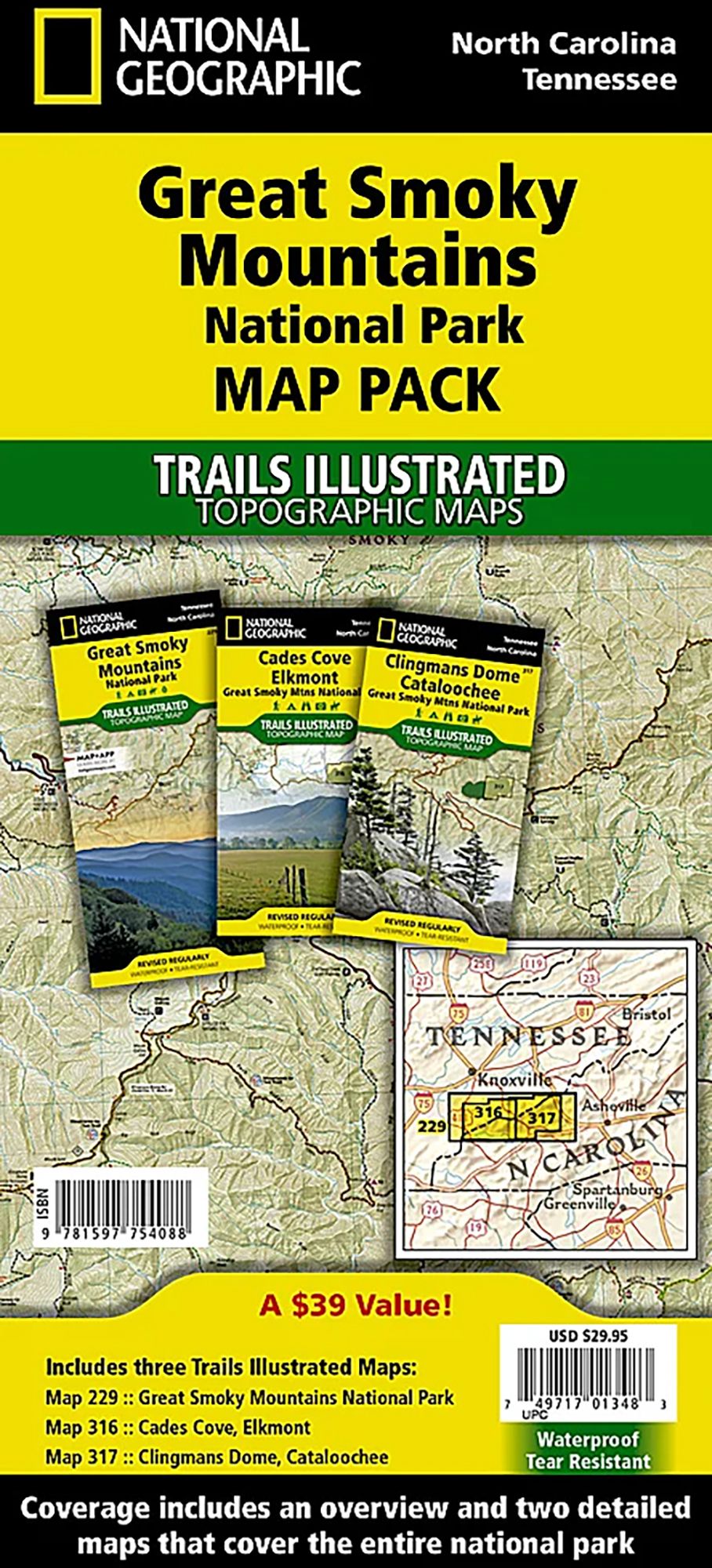 The Great Smoky Mountains National Park Map Pack includes: Map 229 :: Great Smoky Mountains National Park, Map 316 :: Great Smoky Mountains National Park West: Cades Cove, Elkmont, Map 317 :: Great Smoky Mountains National Park East: Clingmans Dome, Cataloochee, Every Trails Illustrated map is printed on "Backcountry Tough" waterproof, tear-resistant paper. A full UTM grid is printed on the map to aid with GPS navigation.