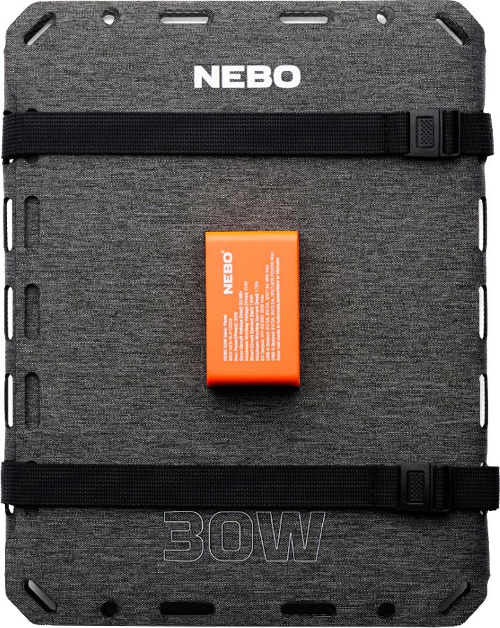 Stay charged wherever you go with the NEBO Reliance® 30W Solar Panel. With a 24.7% sunlight to solar energy conversion rate and premium monocrystalline solar cells, this foldable solar panel allows you to keep your phones, tablets, power stations, and other electronic devices fully charged with clean sustainable energy from the sun. At just over 2 lbs., it is lightweight and portable. The kickstands make it incredibly easy to setup and angle to capture the sun's energy and has versatile charging compatibility via the USB-A, USB-C and DC ports. The perfect companion for the NEBO Rambler® 300 power station, it stacks perfectly on top while folded and attaches with anchor straps to create the easiest-to-transport solar generator on the market.