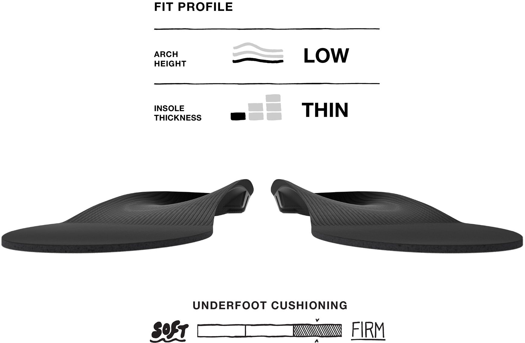 Unbelievable support packed into a slim profile with a low arch height. Gives you support where you need it most, helping redistribute forces to reduce stress and strain on your entire body, not just your feet. Designed to fit well in slim-fitting footwear, even some without removable insoles.