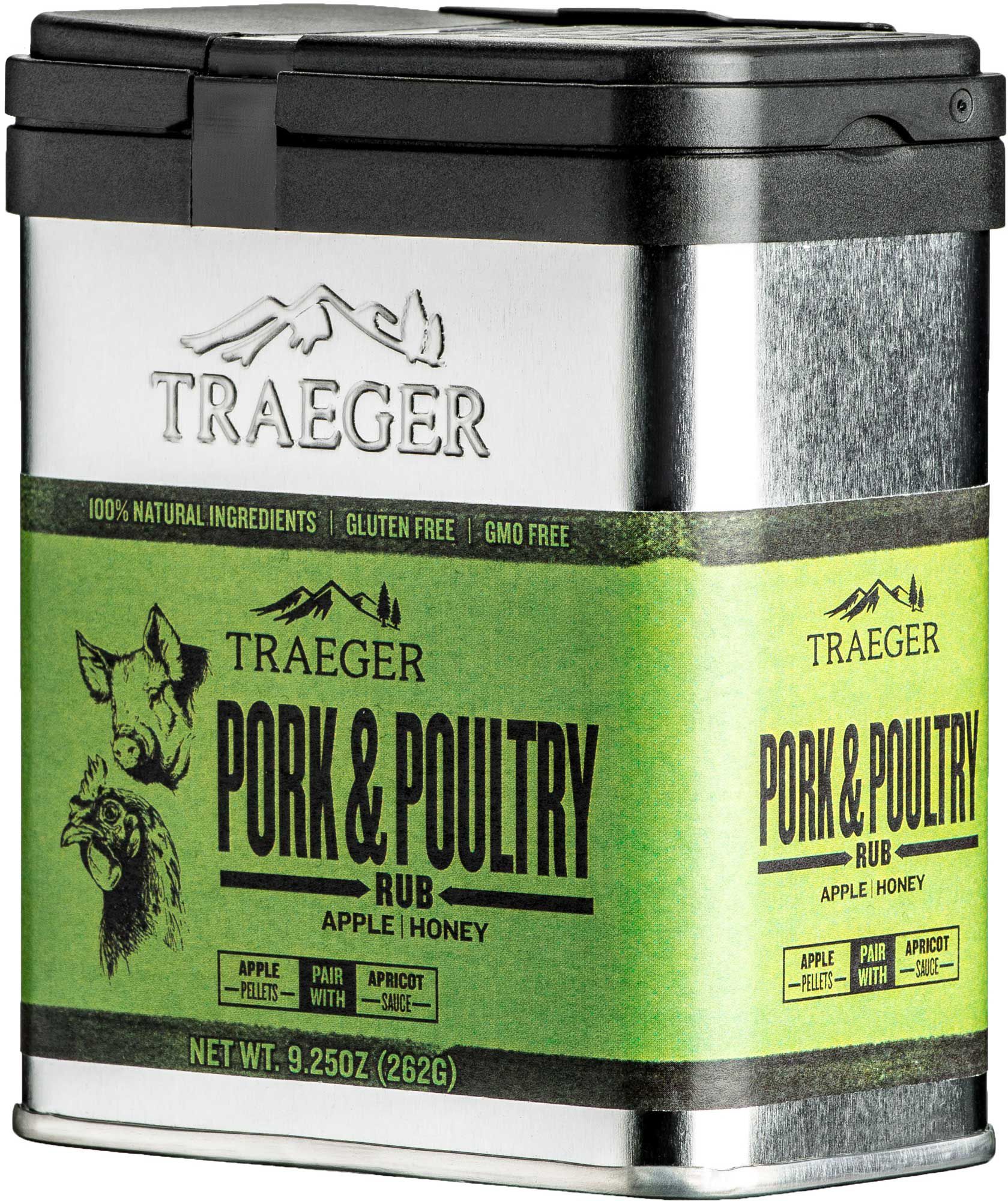 Prep poultry for the grill with the sweet apple and honey flavors of the Traeger Pork & Poultry Rub. This rub is GMO-free, gluten-free, and Kosher, so everyone at your next barbeque can enjoy. It pairs well with Apricot BBQ Sauce and Apple Hardwood Pellets, and comes in aluminum tin.
