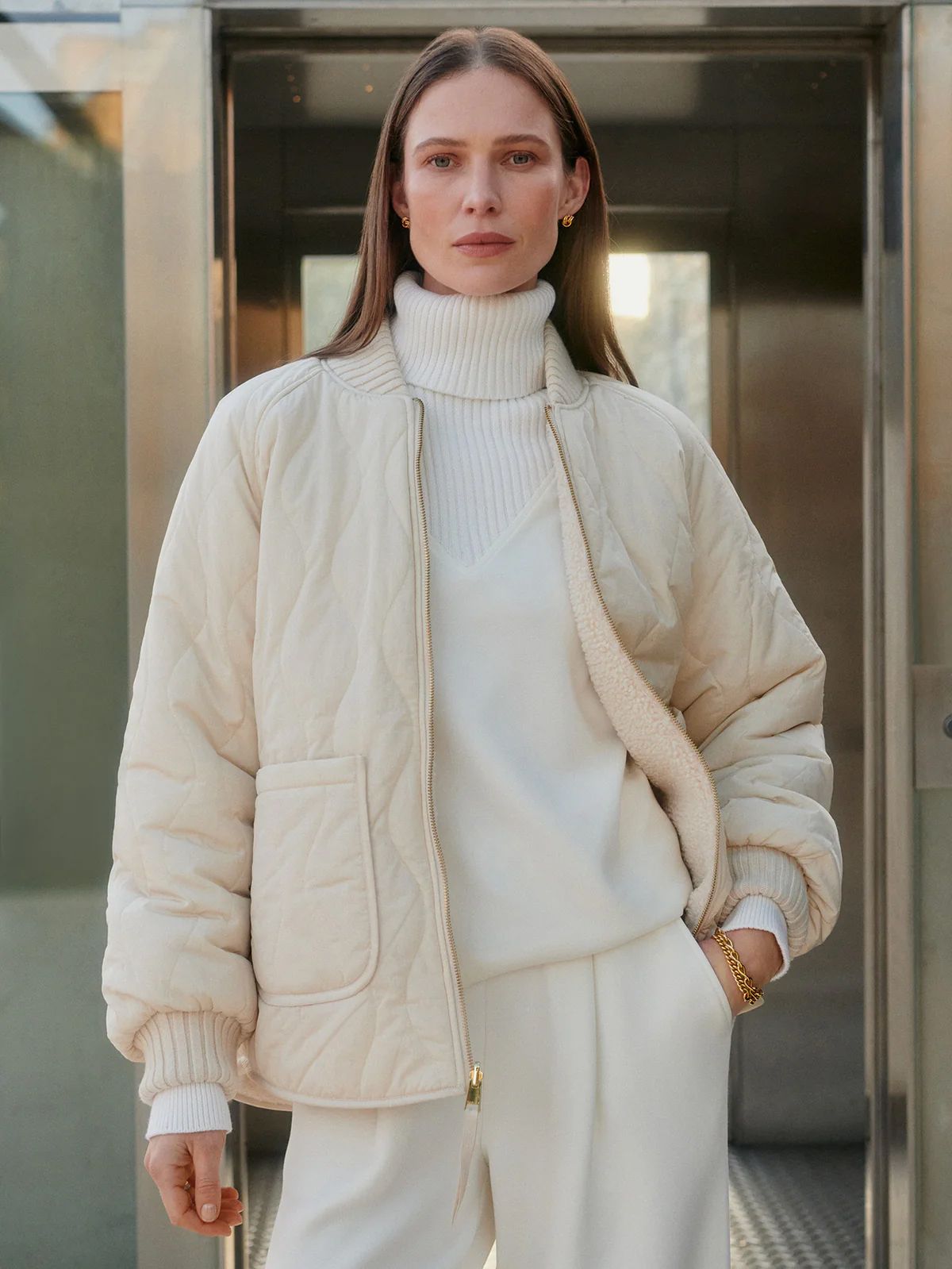 The Serina is made in a tight and curly Bouclé Sherpa with welt pockets on one side, and a Crinkle Shell fabric in an onion quilt design and patch pockets on the other. Both sides of this reversible, throw-on-and-go jacket show the chunky knitted cuffs and collar. Cut to a boxy bomber-shape with a curved hem, the Serina is perfect for cold-weather layering.