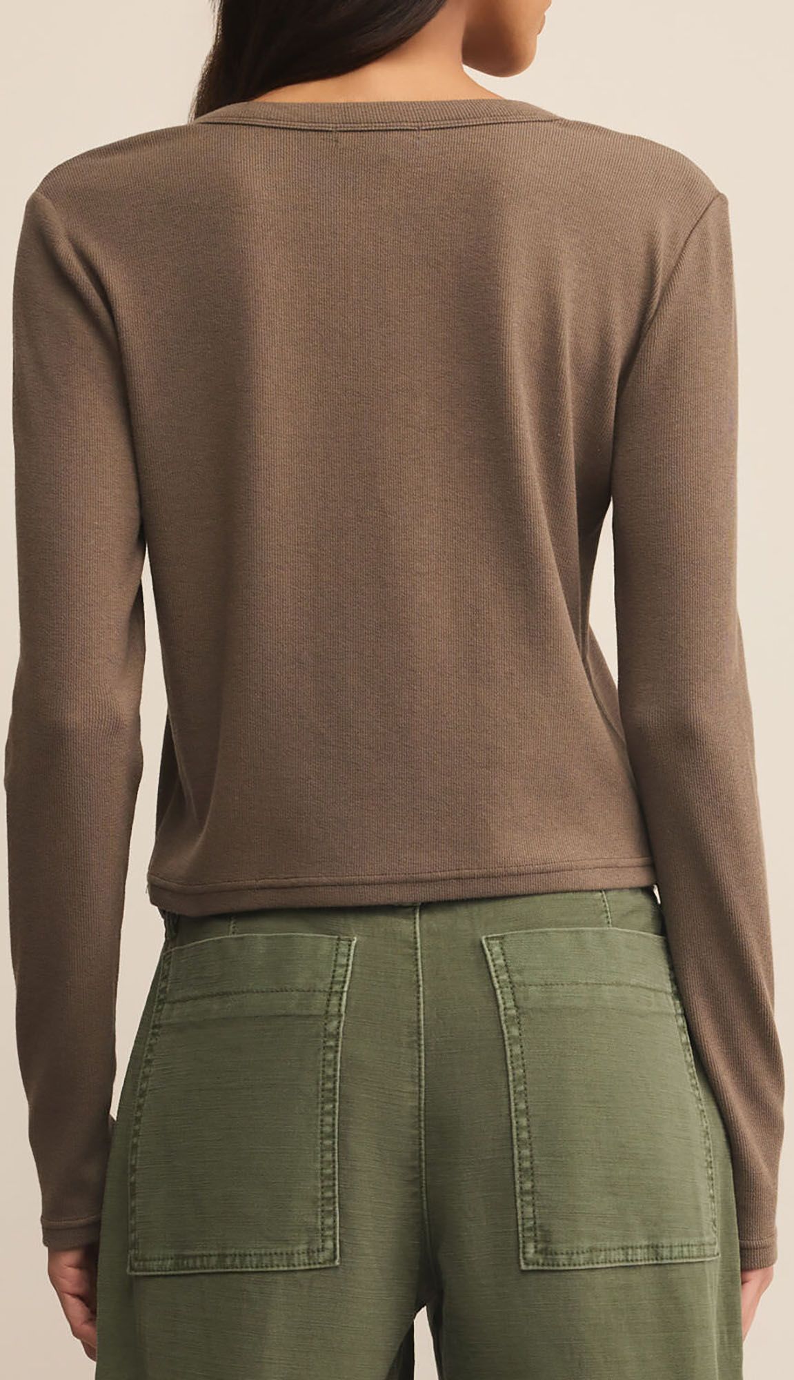 A slightly boxy, cropped henley that keeps things casual but polished. Made with a soft, slub rib knit and finished with a crew neckline, button front, and long sleeves, it’s the kind of top you’ll reach for on repeat.