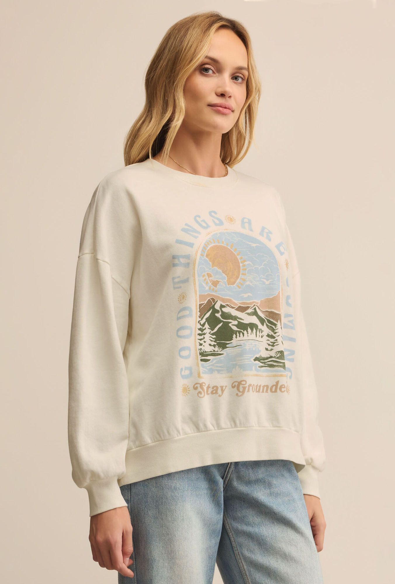 Bring on the good vibes in this cozy oversized sweatshirt, featuring a “Good Things Are Coming” screen print and scenic mountain-lake graphic. Made from ultra-soft brushed cotton fleece, it’s the kind of easy layer you’ll want to live in all season.